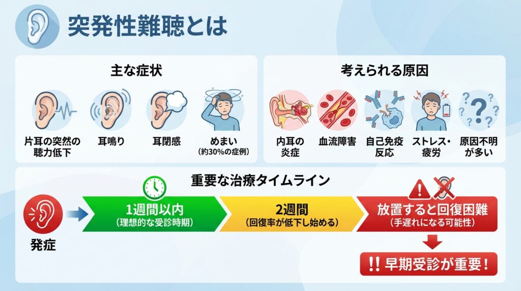 理想的には発症から1週間以内に治療を開始するのが望ましく、2週間以上経過すると聴力回復の確率が大きく低下するとされています。適切な治療のタイミングを逃すと、内耳のダメージが固定化して恒久的な難聴(片耳が聞こえない状態の固定)につながりかねません。